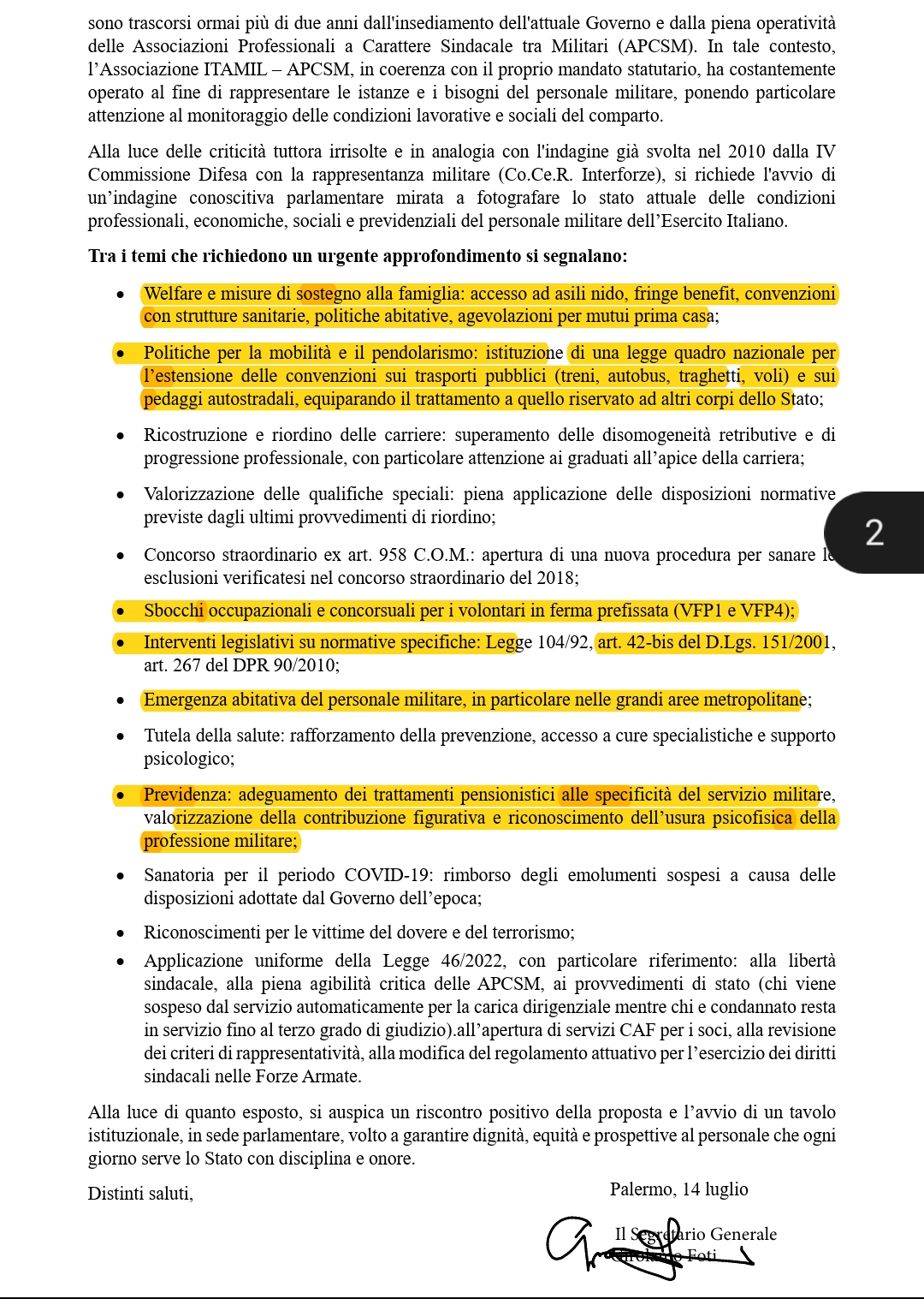 Nel mese di luglio 2025 abbiamo chiesto che vengano audite le APCSM in Commissione Difesa per avviare un ciclo di incontri in materia di valorizzazione economica e professionale, previdenza, mobilità, ricongiungimento familiare, temporanea assegnazione e sbocchi occupazionali per i volontari.