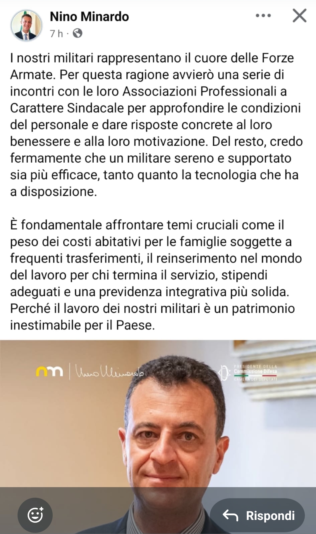 > "I nostri militari rappresentano il cuore delle Forze Armate. Per questa ragione avvierò una serie di incontri con le loro Associazioni Professionali a Carattere Sindacale per approfondire le condizioni del personale e dare risposte concrete al loro benessere e alla loro motivazione. Del resto, credo fermamente che un militare sereno e supportato sia più efficace, tanto quanto la tecnologia che ha a disposizione. È fondamentale affrontare temi cruciali come il peso dei costi abitativi per le famiglie soggette a frequenti trasferimenti, il reinserimento nel mondo del lavoro per chi termina il servizio, stipendi adeguati e una previdenza integrativa più solida. Perché il lavoro dei nostri militari è un patrimonio inestimabile per il Paese."